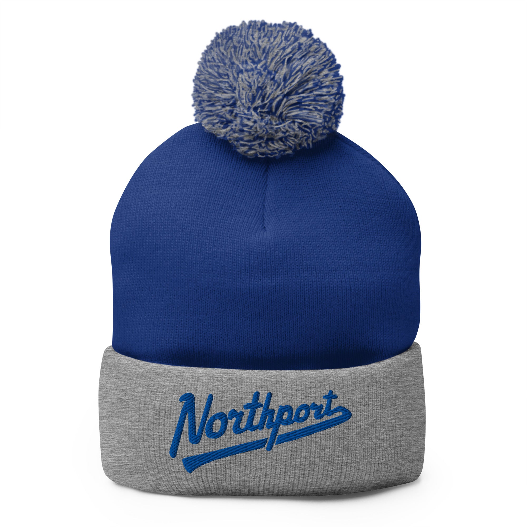 Northport Script Embroidered Pom-Pom Beanie - Blue / Gray